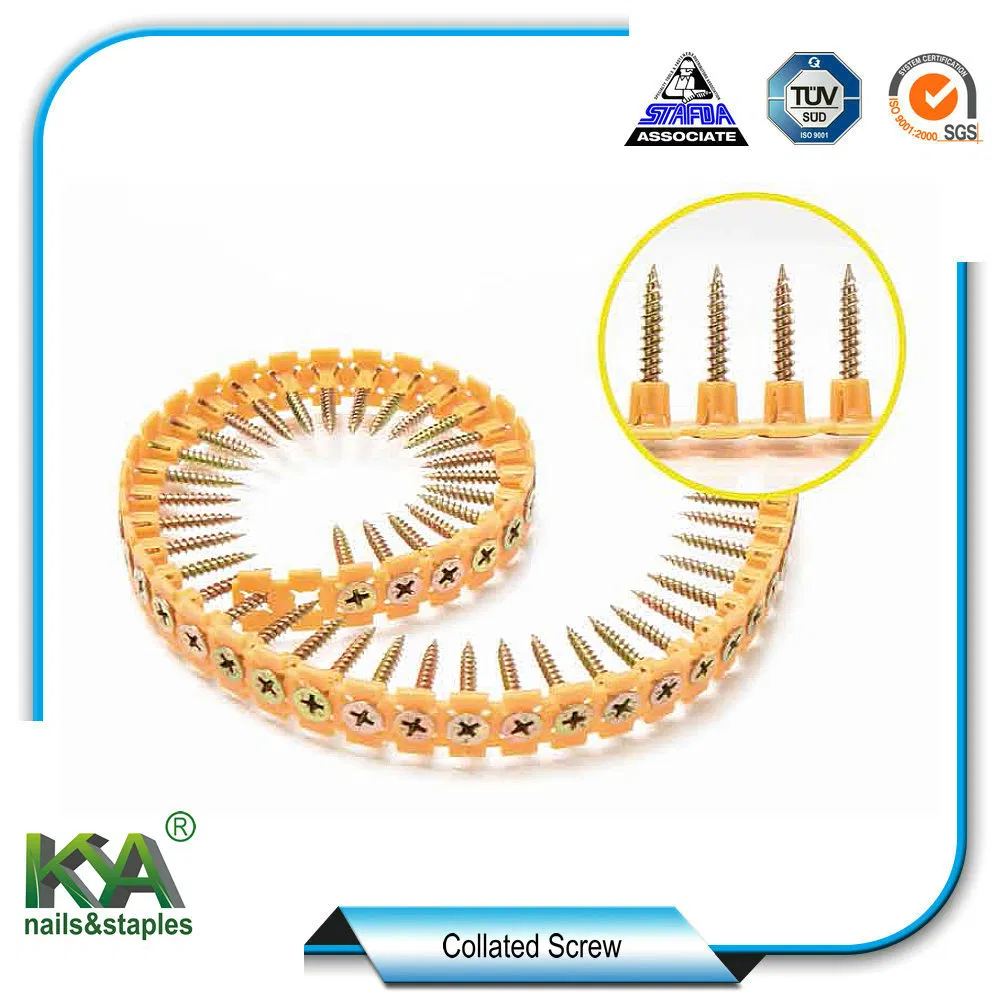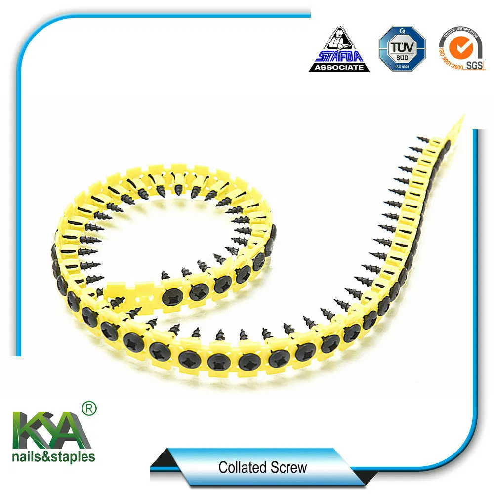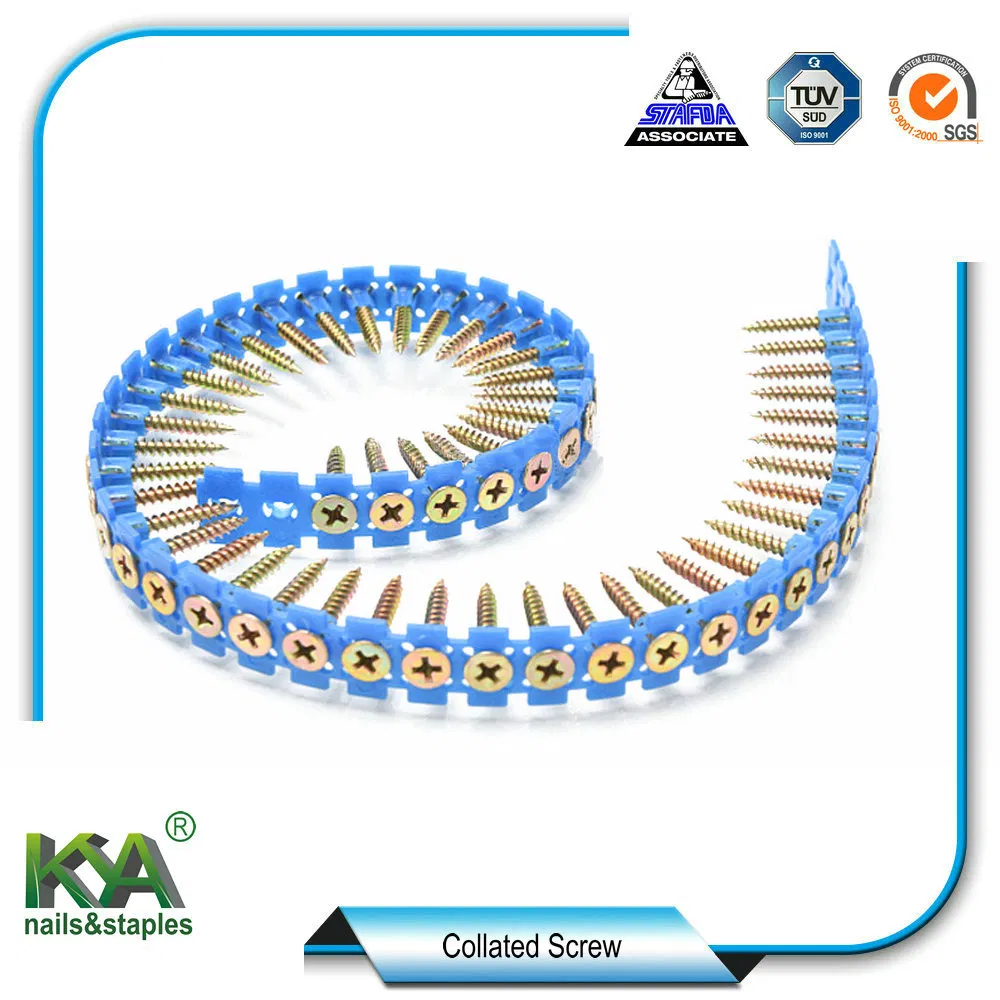 Product Description: NamePlastic Strip Carbon Steel C1022 Collated Wood ScrewsDiameter3.5mm-5.5mmLength25mm-75mmScrew TypeCoarse & Fine & Self DrillingMaterialCarbon Steel C1022AHead typeBugle HeadHeadPHILPointSharpSurface treatmentBlack Phosphating & Gery Phosphating & Yellow ZINC&a......